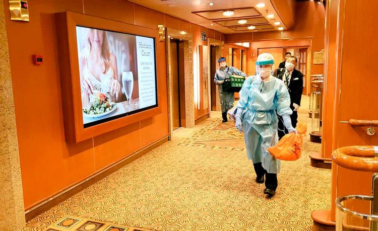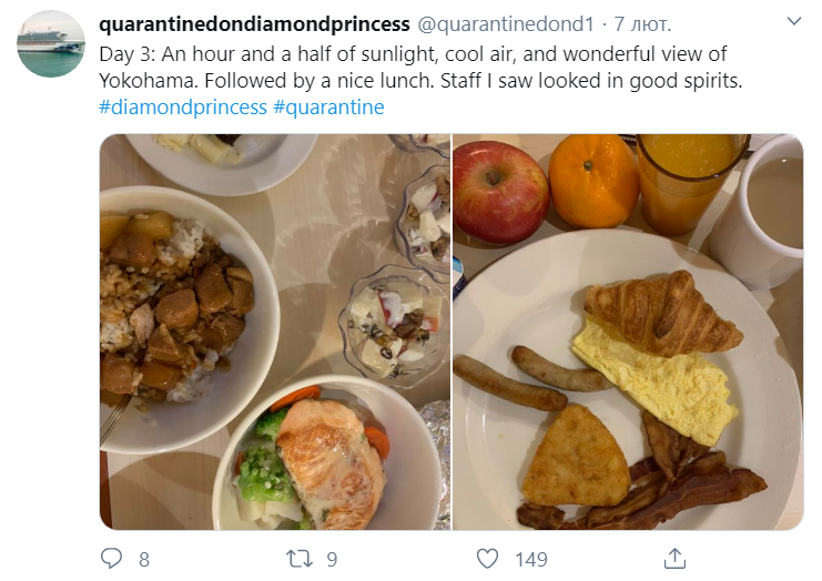 На лайнері доступний Wi-Fi, який і рятує туристів від нудьги. Вони тільки так можуть спілкуватися між собою, якщо знаходяться в різних каютах. Особливо популярні пости про їжу. На вірус пасажирів тестують вибірково - при наявності симптомів і контактів з раніше зараженими.