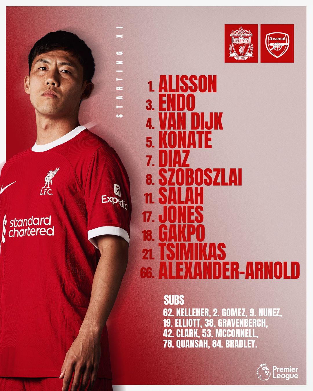 Ліверпуль: 1. Алісон Бекер - 21. Костас Цімікас, 4. Вірджил ван Дейк, 5. Ібраїма Конате, 66. Трент Александер-Арнольд - 17. Кертіс Джонс, 3. Ватару Ендо, 8. Домінік Собослаї - 7. Луїс Діас, 18. Коді Гакпо, 11. Мохамед Салах
