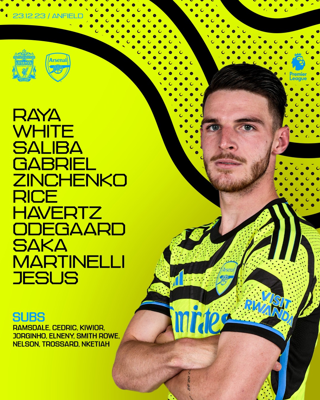 Арсенал: 22. Давід Рая - 35. Олександр Зинченко, 6. Габріел, 8. Вільям Саліба, 4. Бен Вайт - 29. Кай Хаверц, 41. Деклан Райс, 8. Мартін Едегор - 11. Габріел Мартінеллі, 9. Габріел Жезус, 7. Букайо Сака
