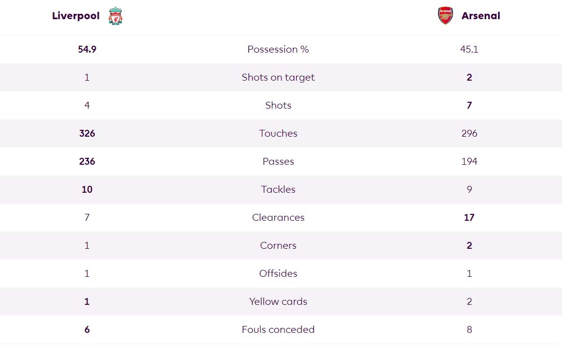 20:23. і до вашої уваги статистика першого тайму. Гостріше почали "каноніри", а от кінцівку тайму активніше провів "Ліверпуль"