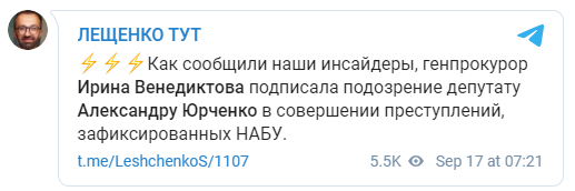 При цьому вранці 17 вересня член наглядової ради "Укрзалізниці" Сергій Лещенко з посиланням на інсайдерів написав у себе в телеграм-каналі, що глава ГПУ все ж підписала підозра Юрченко.