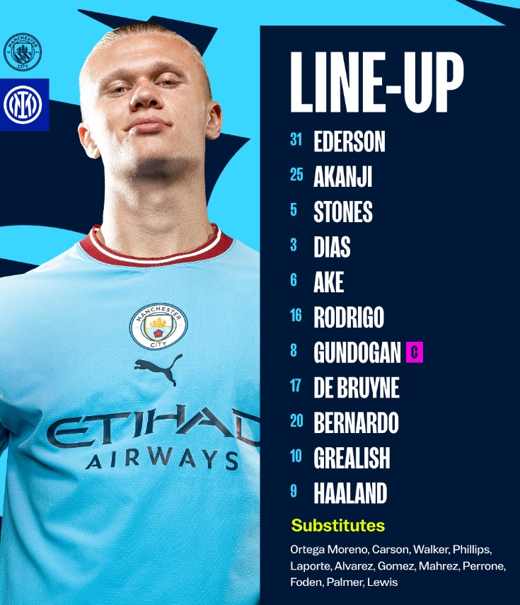 МС: 31. Едерсон - 25. Мануель Аканджи, 3. Рубен Діаш, 6. Натан Аке - 5. Джон Стоунз, 16. Родрі - 20. Бернарду Сілва, 17. Кевін де Брюйне, 8. Ілкай Гюндоган (к), 10. Джек Гріліш - 9. Ерлінг Холанн