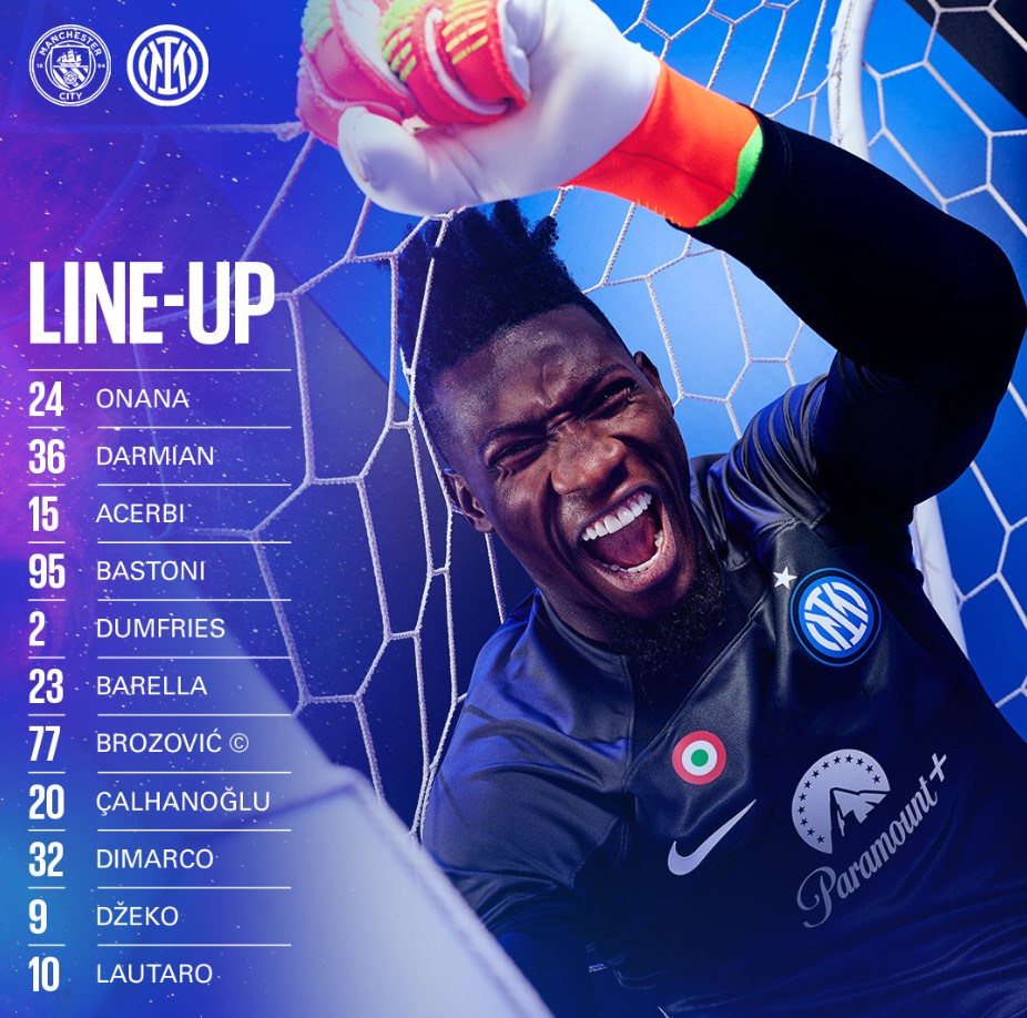 Інтер: 24. Андре Онана - 95. Алессандро Бастоні, 15. Франческо Ачербі, 36. Маттео Дарміан - 32. Федеріко Дімарко, 20. Хакан Чалханоглу, 77. Марцело Брозович (к), 23. Ніколо Барелла, 2. Дензел Думфріс - 9. Едін Джеко, 10. Лаутаро Мартінес