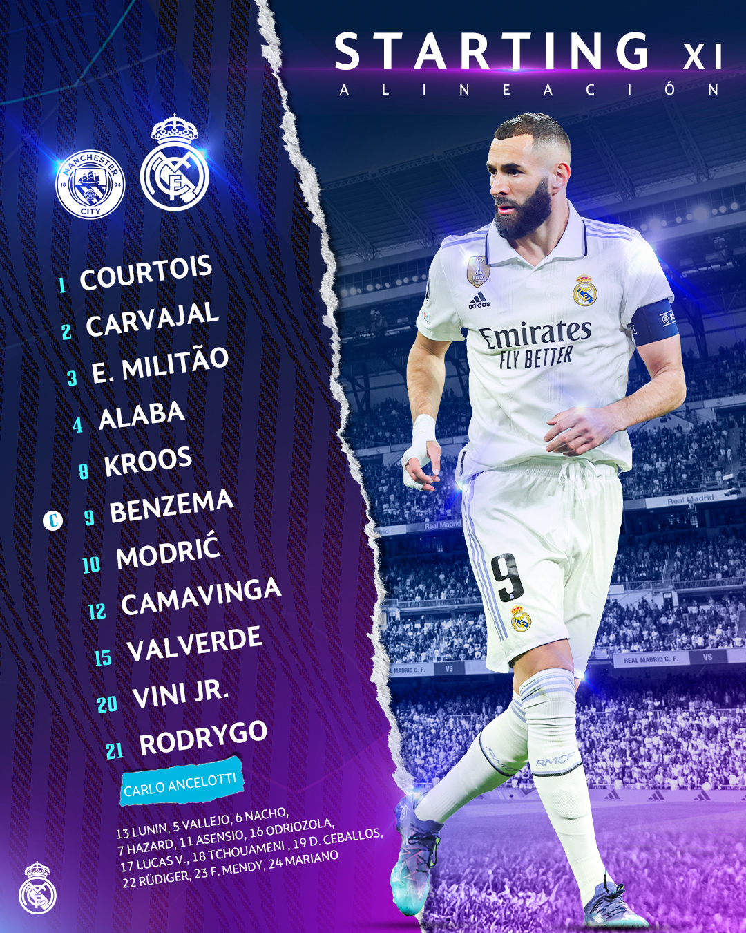 Реал: 1. Тібо Куртуа - 12. Едуардо Камавінга, 4. Давид Алаба, 3. Едер Мілітао, 2. Дані Карвахаль - 10. Лука Модріч, 8. Тоні Кроос, 15. Федеріко Вальверде - 20. Вінісіус Жуніор, 9. Карім Бензема (к), 21. Родріго