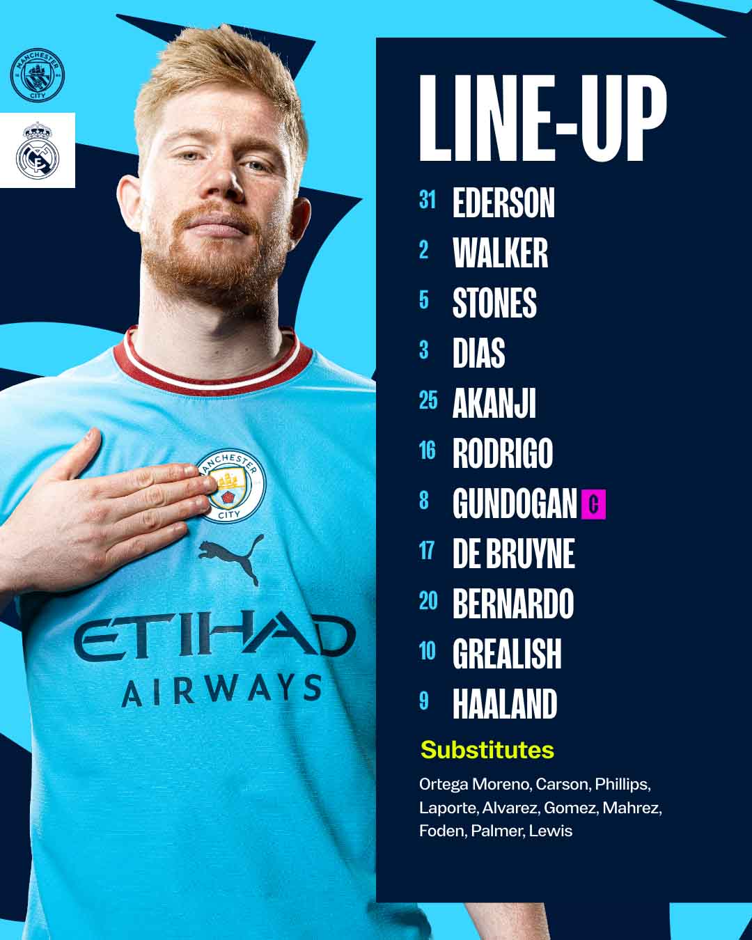 МС: 31. Едерсон - 2. Кайл Вокер, 3. Рубен Діаш, 25. Мануель Аканджи - 5. Джон Стоунз, 16. Родрі - 20. Бернарду Сілва, 17. Кевін де Брюйне, 8. Ілкай Гюндоган (к), 10. Джек Гріліш - 9. Ерлінг Холанн