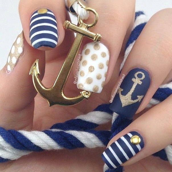 Також оригінально може виглядати морський манікюр в стилі пінап. Якорі, смужки, горошок - все це можна поєднувати між собою для отримання цікавого результату.