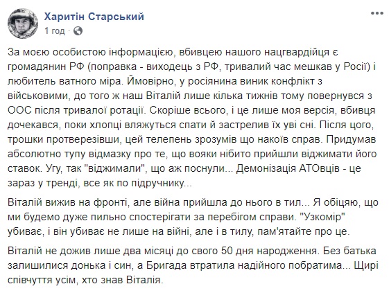 Прес-офіцер бригади НГУ Харитон Старський висунув свою версію, зазначивши, що вбивця є прихильником "русского мира".