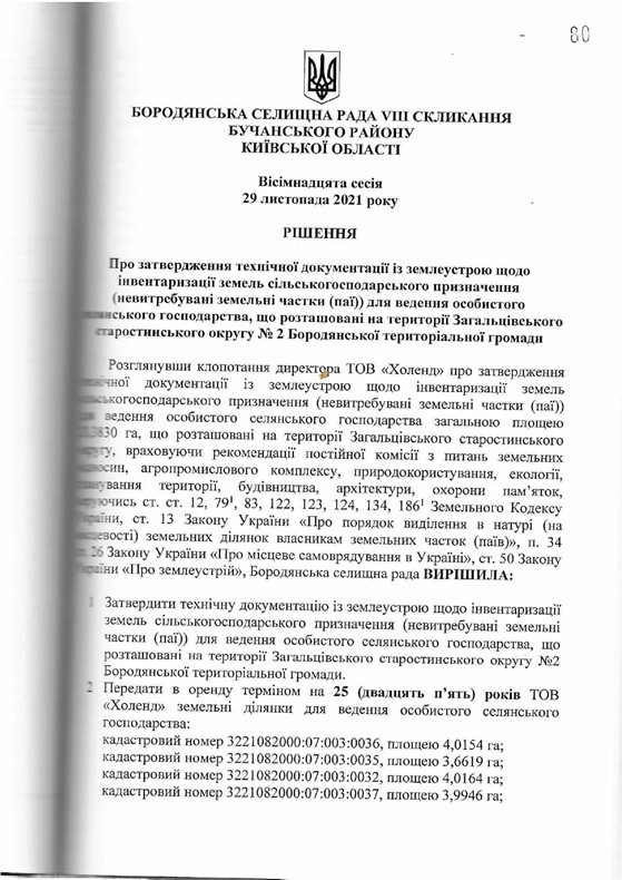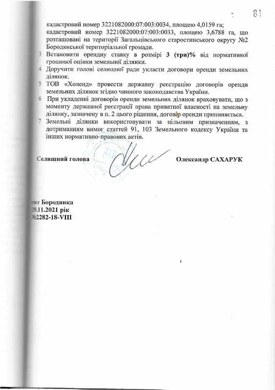 Одне з чотирьох рішень Бородянської селищної ради від 21.11.2021 р. про передавання земель пайовиків в оренду ТОВ "Холенд" з підписом Олександра Сахарука