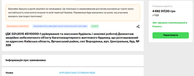Закупівлі без тендерів на демонтаж двох багатоповерхівок у Бородянці, розміщені Бородянською селищною радою. Джерело: сайт "Прозорро"