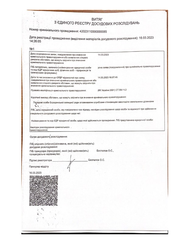 Кримінальне провадження за фактом заволодіння земельними ділянками посадовцями Бородянської селищної ради, відкрите 14.03.2023 р. Витяг з Єдиного державного реєстру досудових розслідувань