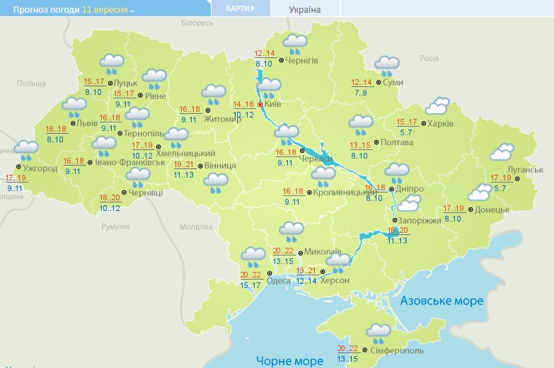 У понеділок, 12 вересня, синоптики прогнозують дощі на всій території України.