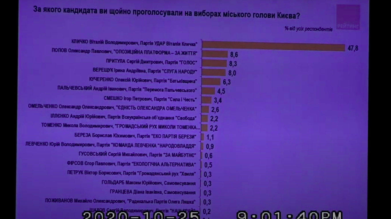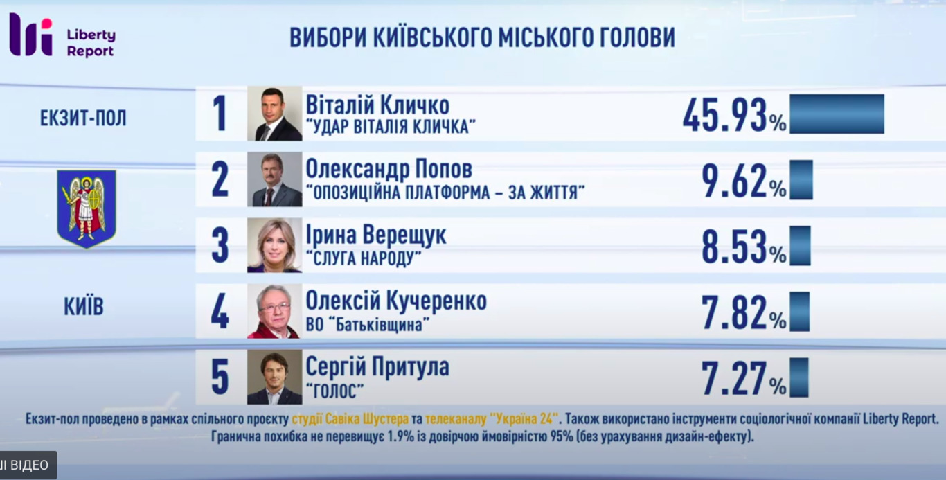 20:06 Згідно з даними двох екзит-полів, на виборах мера Києва лідирує Віталій Кличко.