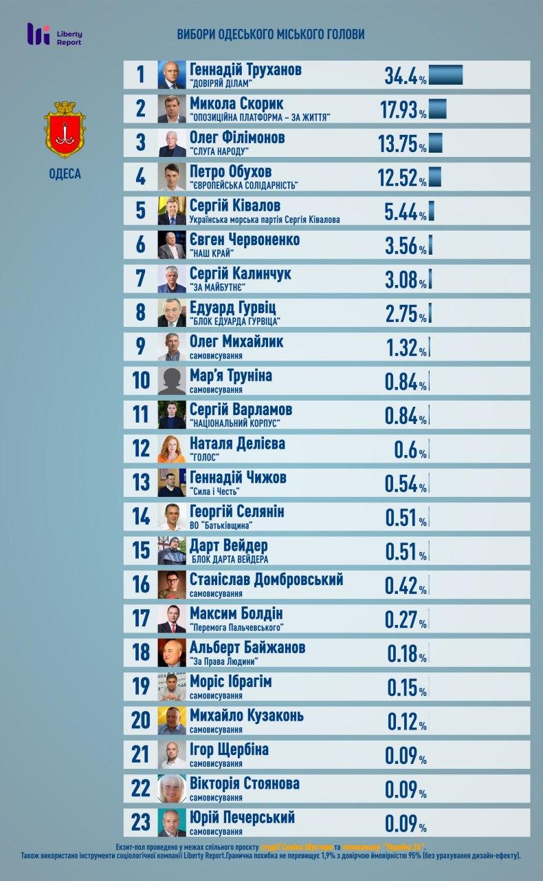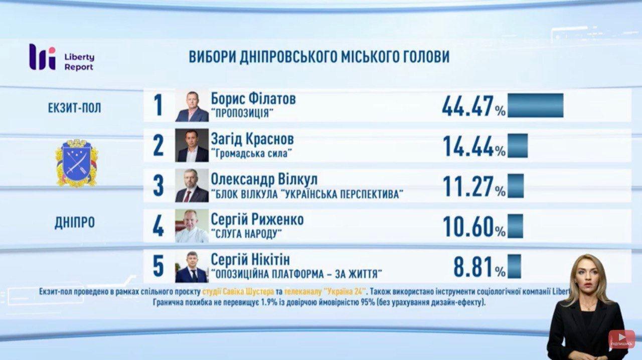 На виборах в Кривому Розі перемагає чинний мер Юрій Вілкул з 51,8% голосів виборців, свідчать дані екзит-пол, проведеного громадським союзом Фонд інноваційних проектів. Найближчий суперник від партії Слуга народу Дмитро Шевчик набирає лише 24,4% голосів виборців.