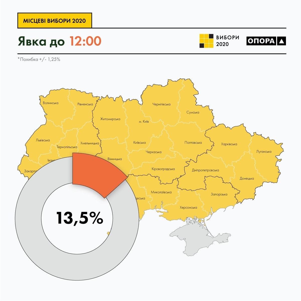 14:20 Явка виборців на 12:00 становить 13,5%. Такі дані повідомляє Громадянська мережа "Опора". Похибка дослідження явки не перевищує 1,2%.