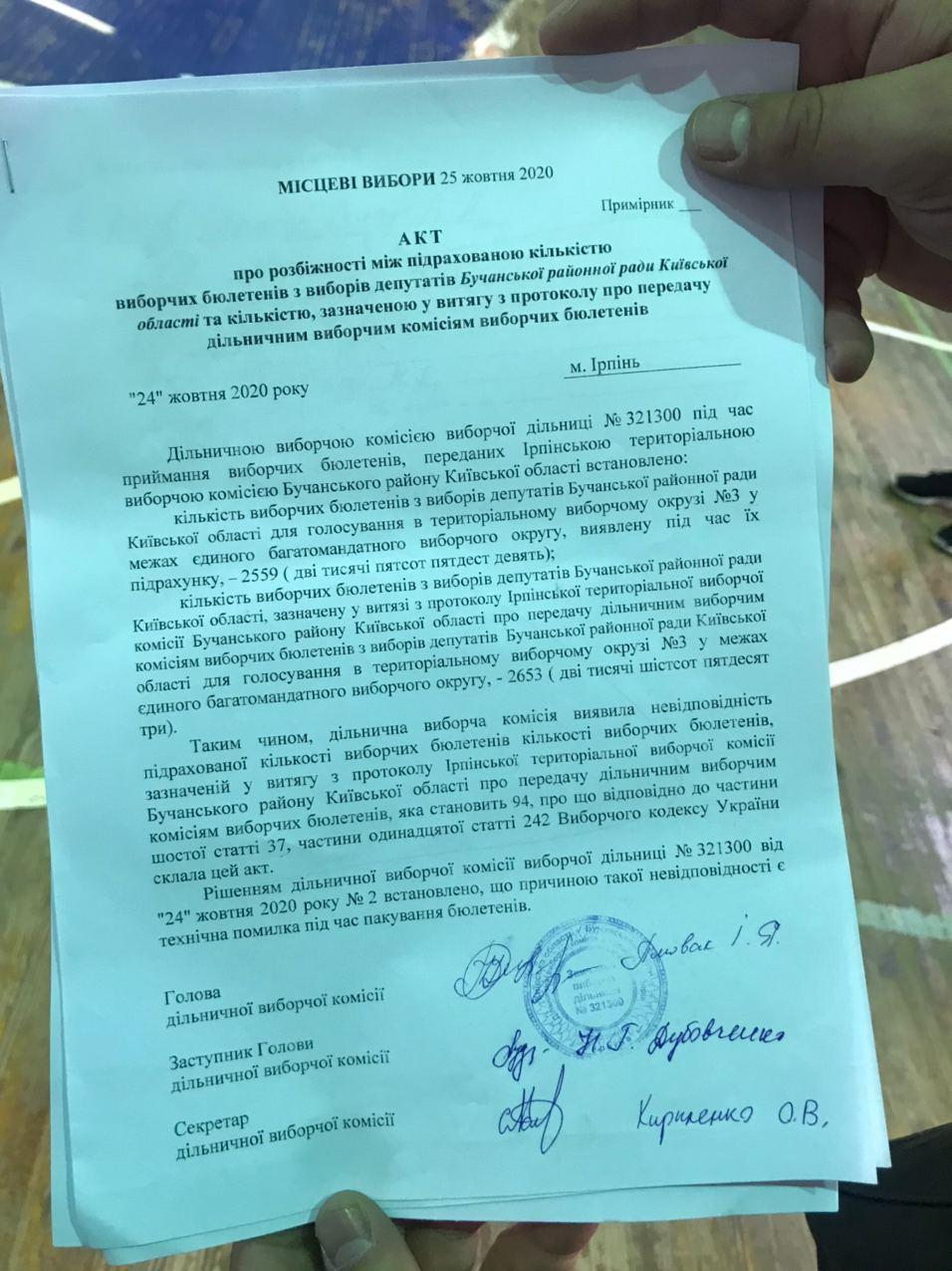 09:35 Дільниця 321300, Ірпінь. Бюлетенів менше, ніж виборців. Склали акт про порушення.