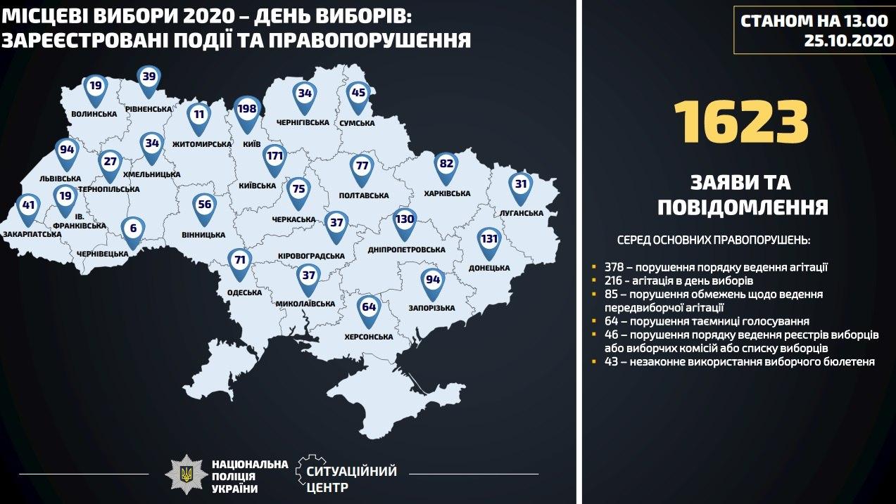 13:45 Станом на 13:00 поліція зафіксувала 1 623 заяв та повідомлень, пов'язаних з виборчим процесом, найбільше - в Києві - 198. За 18 фактами по Україні порушено кримінальні провадження.