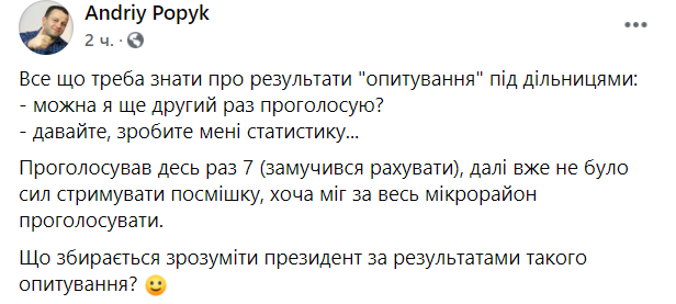 12:20 У Хмельницькому координатор громадянської мережі "Опора", блогер Андрій Попик зумів сім разів поспіль взяти участь в опитуванні президента України Володимира Зеленського.
