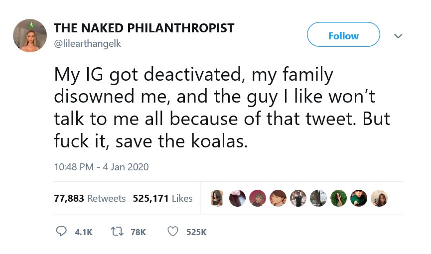 "Мій аккаунт в Instagram деактивували, моя родина відреклася від мене, і хлопець, який мені подобається, не навряд чи стане спілкуватися зі мною, все через цей твітт. Але до біса все це. Врятуємо коал", - написала вона, зібравши на цей раз більше 500 тисяч лайків і тисячі коментарів з подяками.