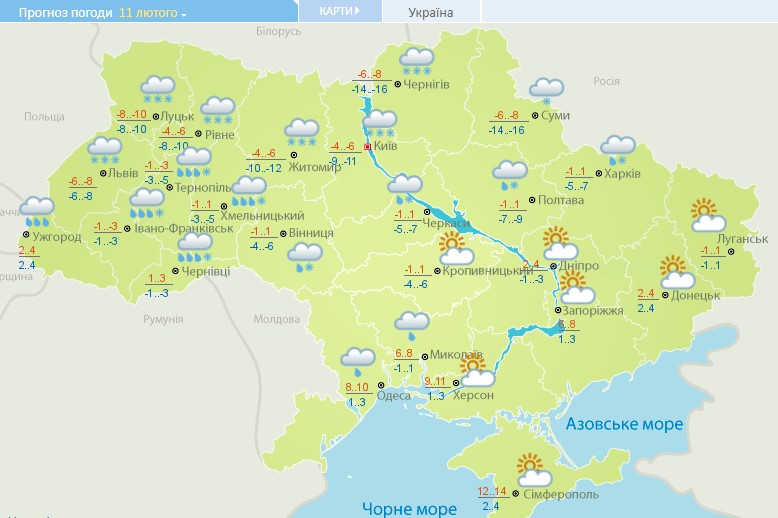 Ситуація з опадами кардинально зміниться у четвер, 11 лютого. Рясні снігопади, місцями дощ з мокрим снігом, будуть на заході і півночі країни. А ось на півдні і сході буде хмарно, але сухо.