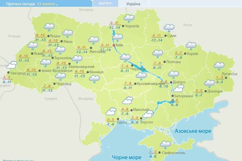 Вдень 10-градусний мороз збережеться на заході. У північних областях очікується -4-6, в центрі - від нуля до -4, на сході і півдні - від 3 до 7 тепла, а в Одеській області прогнозується -1+1.