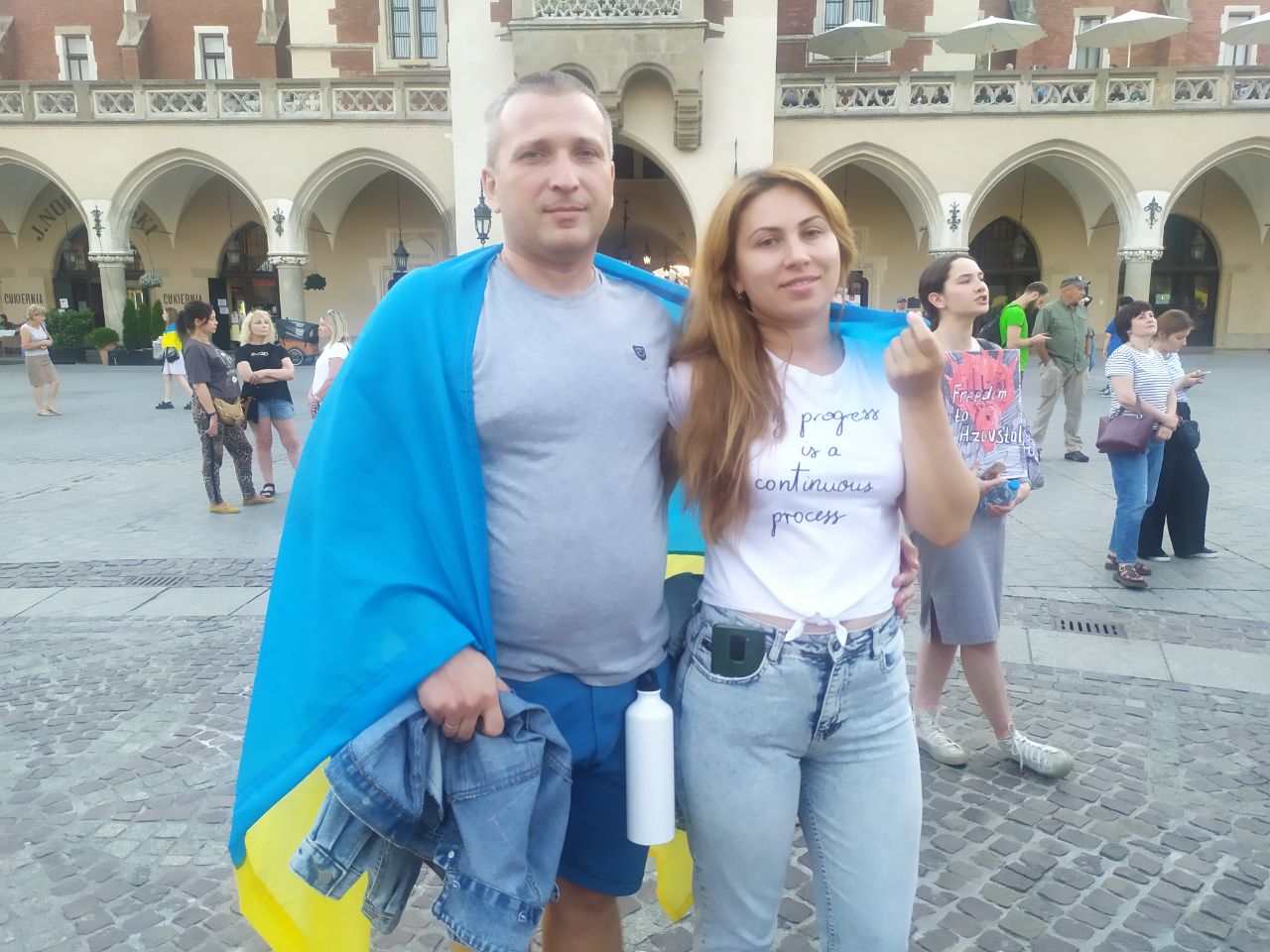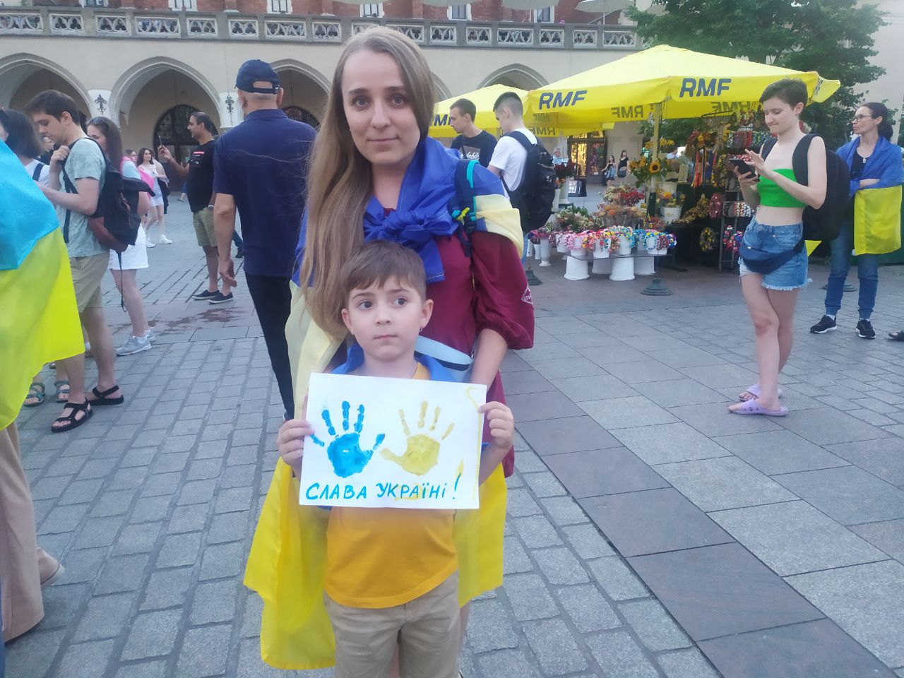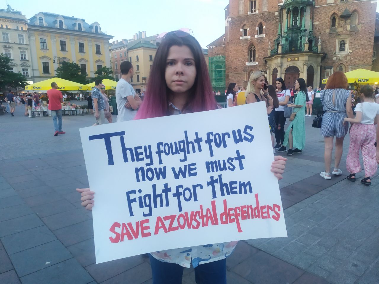 На центральній площі Ринок у Кракові як завжди велелюдно. І вже традиційно тут рясно від жовто-блакитних кольорів. Цього разу Суконні ряди на головній площі міста розділили одразу два українські заходи: на одній половині виступала Аліна Паш на великій сцені у рамках музичного фестивалю Wianki, а на іншій, де пам"ятник Адаму Міцкевичу - люди з плакатами вийшли підтримати полонених "Азовсталі" з Маріуполя.