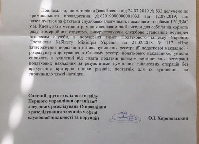 "У липні 2019 Державне Бюро розслідування початок кримінальне провадження, яка розслідується за фактами службових зловживань посадовими особами ГУ ДФС в м.Києві. У кримінальній справі йдеться, що Демченко навмисне сприяла в ухиленні від сплати податків шляхом забезпечення реєстрації податкових накладних за результатами сумнівних фінансових операцій ", - зазначає експерт, додаючи, що в 2014-2015 роках прокуратура розслідувала справу проти Демченко, де вона підозрювалася у зловживанні службовим становищем. Однак, справа не закінчилася нічим, а Демченко пішла на підвищення. Тоді ЗМІ писали, що допомогла їй закрити кримінальне провадження тодішній народний депутат Ніна Южаніна.