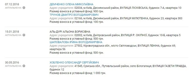 Перший засновник Хобленко Олександр Сергійович. Фірма мала назву "Клайд груп", 24.01.2017 року Хобленко продає фірму. Власником стає Шаповалова Ірина Володимирівна. В цей же час і змінюється назва на нинішнє. 18.08.2017 року процентна частка підприємства ділиться наполовину і ще одним співвласником стає дочка Демченко Людмили - Аль-Дурі Олена. З цього часу дане ТОВ починає тісно співпрацювати з фірмами Демченко Бориса. 20.03.2018 року в даному ТОВ повністю змінюються засновники і директор. Одна з фірма і надалі співпрацює з фірмами Демченко Бориса.