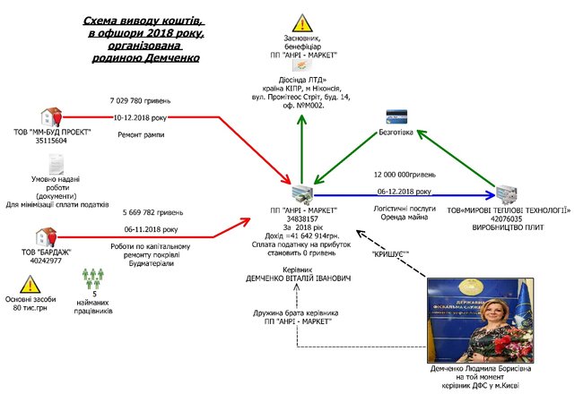 "Відомо, що Демченко Віталій є керівником ТОВ" Ані-Маркет. До 21.05.2019 року засновником і бенефіціаром даного ПП була кіпрська офшорна компанія "Діосінда ЛТД". Фактично сім'я Демченко створила схему виведення фіктивного ПДВ з бюджету України прямо в офшори ", - говорить аналітик.