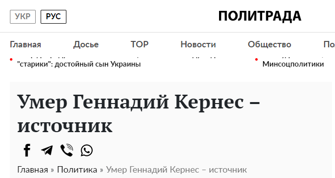 Першоджерело новини про смерть мера Харкова, як звернули увагу журналісти, з'явилося 3 листопада о 13:37 на сайті "Політрада". "Як повідомляють наші джерела в Міністерстві внутрішніх справ, сьогодні вдень помер мер Харкова Геннадій Кернес", - повідомило видання, додавши, що офіційного підтвердження цієї інформації поки що немає.