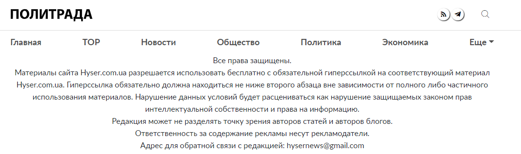 Незважаючи на нові жорсткі вимоги пошукових систем, на сайті "Політрада" немає жодної згадки про склад редакції. А в футере ЗМІ і зовсім чомусь вказана інформація з "братнього" сайту Hyser.