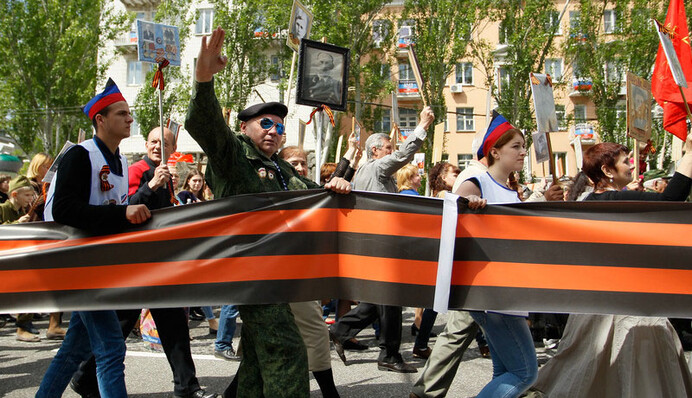 Колонами пройшли "МНС-ники" і "МВС-ники", "курсанти військового училища" і бойовики. Запрошений оркестр бадьоро зіграв усі відомі військові пісні, втуливши поміж них і неофіційний гімн Російської імперії "Слався, слався, ти Русь моя" з опери Михайла Глінки "Іван Сусанін" (інша назва – "Життя за царя"). Еклектичності додавали пенсіонери, які співали радянських пісень воєнних років, тримаючи при цьому в руках російський імператорський прапор-триколор.