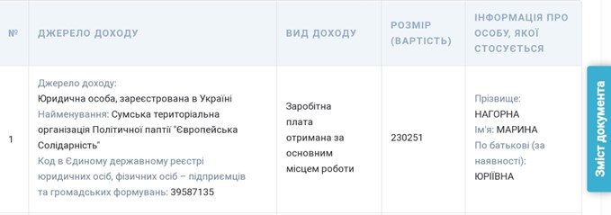 Єдина робота Нагірної, судячи з декларації – керівник Секретаріату партії "Європейська Солідарність" (ще з 2016 р.). Тільки тут вона одержує офіційну зарплату. Але виникає логічне питання – чи не ця посада є лише ширмою для роботи на користь агресора?