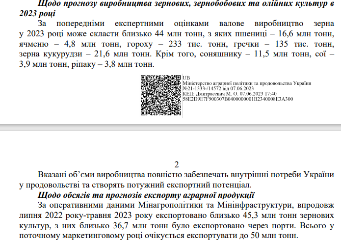 За даними Мінагрополітики, поточного маркетингового року, який почався 1 липня 2022 року, станом на початок червня цього року з України було експортовано близько 45,3 мільйона тонн зернових культур, з яких близько 36,7 мільйона тонн - через порти. "Всього у поточному маркетинговому році (до кінця червня 2023 року - "Апостроф") очікується експортувати до 50 мільйонів тонн", - повідомили виданню в міністерстві.