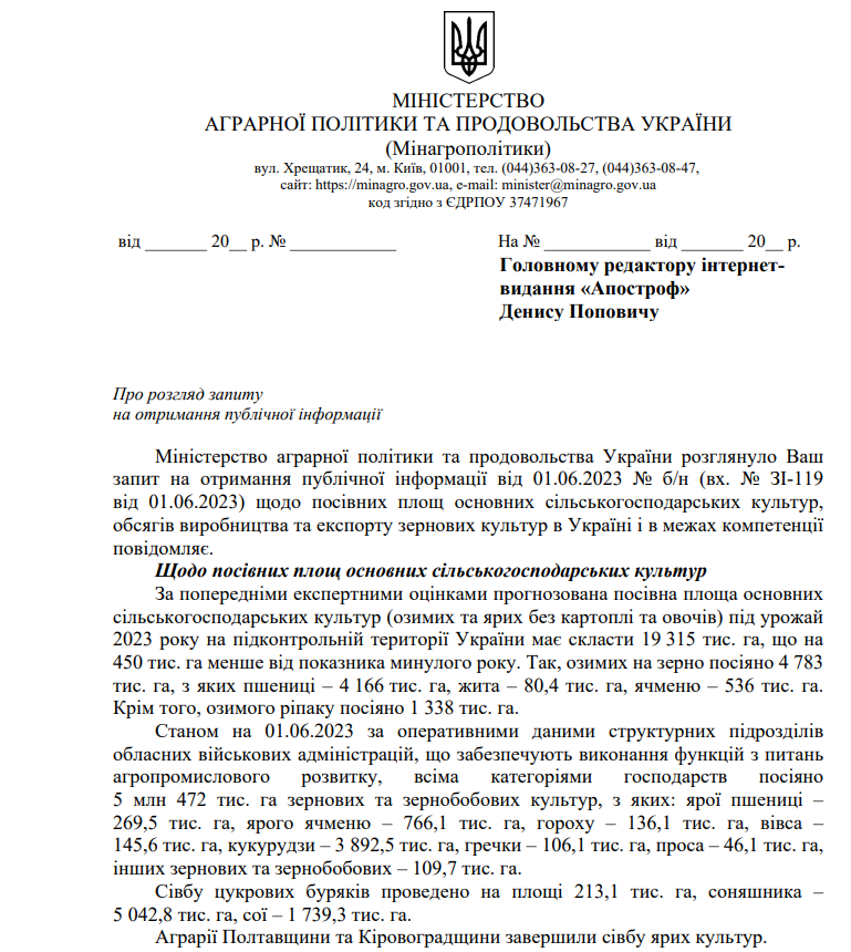 За оперативними даними Мінагрополітики, станом на 1 червня 2023 року ярою пшеницею засіяно 269,5 тисячі гектарів, ярим ячменем – 766,1 тисячі гектарів, а також горохом - 136,1 тисячі гектарів, вівсом – 145,6 тисячі гектарів, кукурудзою – майже 3,9 мільйона гектарів, гречкою – 106,1 тисячі гектарів, просом – 46,1 тисячі гектарів, іншими зерновими та зернобобовими – 109,7 тисячі гектарів.