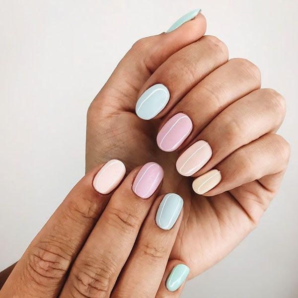 Цікавий і дуже простий манікюр - нігті різних кольорів, але в одній гамі. Підберіть покриття, які будуть добре поєднуватися між собою, і просто нанесіть їх по одному кольору на кожен пальчик.