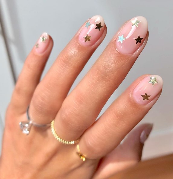 Почнемо з простого. Відмінний варіант самостійного манікюру - однотонний дизайн з фігурними блискітками. Такі блискітки продаються як в готових лаках, так і в розсипчастому вигляді. Досить нанести бажану кількість прикрас на сухе кольорове покриття, після чого закріпити результат прозорим лаком.