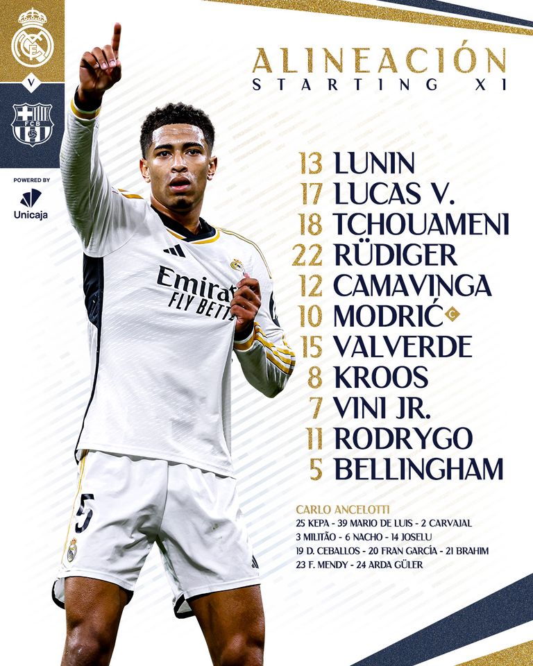 Реал: 13. Андрій Лунін - 12. Едуарду Камавінга, 18. Орельєн Чуамені, 22. Антоніо Рюдігер, 17. Лукас Васкес - 10. Лука Модріч, 8. Тоні Кроос, 15. Федеріко Вальверде - 7. Вінісіус Жуніор, 5. Джуд Беллінгем, 11. Родріго