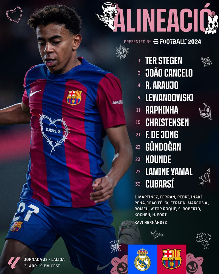 Барселона: 1. Марк-Андре тер Штеген - 2. Жоау Канселу, 33. Пау Кубарсі, 4. Рональд Араухо, 23. Жюль Кунде - 22. Ілкай Гюндоган, 15. Андреас Крістенсен, 21. Френкі де Йонг - 11. Рафінья, 9. Роберт Левандовськи, 27. Ламін Ямаль