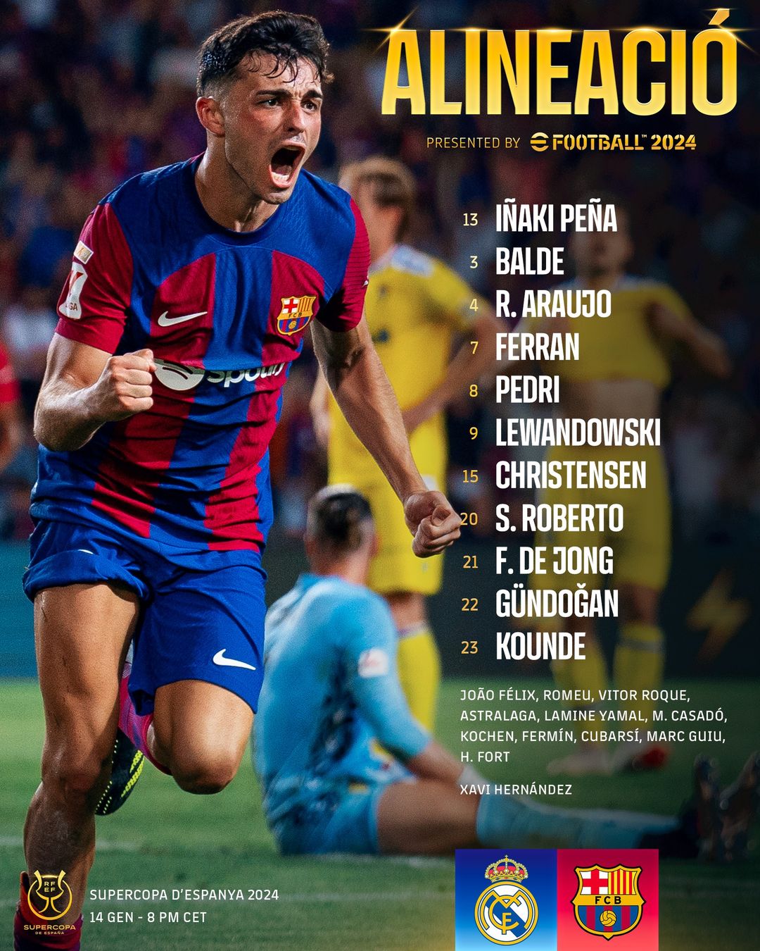 Барселона: 13. Ігнасіо Пенья - 3. Алехандро Бальде, 15. Андреас Крістенсен, 4. Рональд Араухо, 23. Жюль Кунде - 21. Френкі де Йонг, 22. Ілкай Гюндоган, 20. Серхі Роберто - 7. Ферран Торрес, 9. Роберт Левандовськи, 8. Педрі
