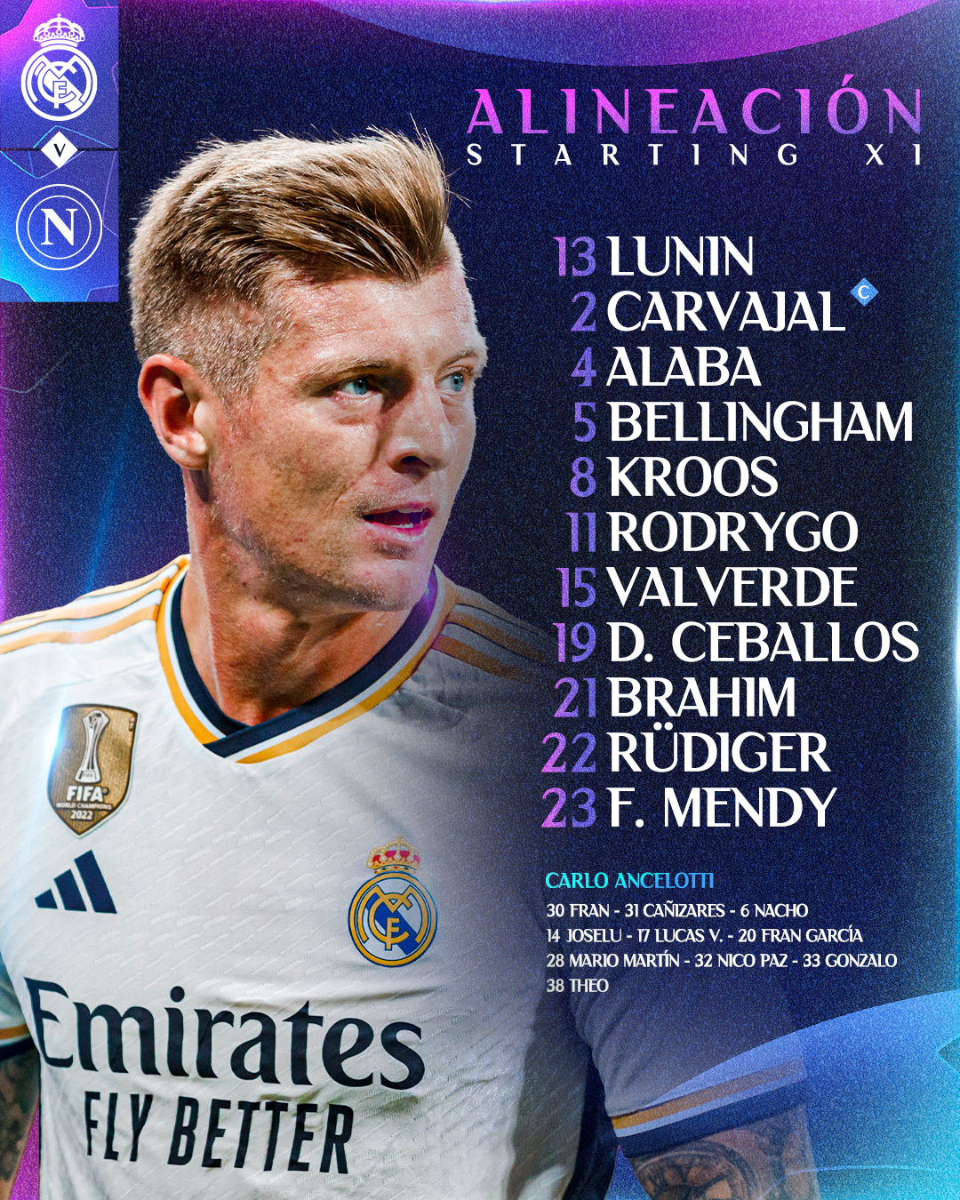 Реал: 13. Андрій Лунін - 23. Ферлан Менді, 4. Давид Алаба, 22. Антоніо Рюдігер, 2. Дані Карвахаль (к) - 8. Тоні Кроос, 15. Федеріко Вальверде - 5. Джуд Беллінгем, 11. Родріго, 21. Браїм Діас, 19. Дані Себальос