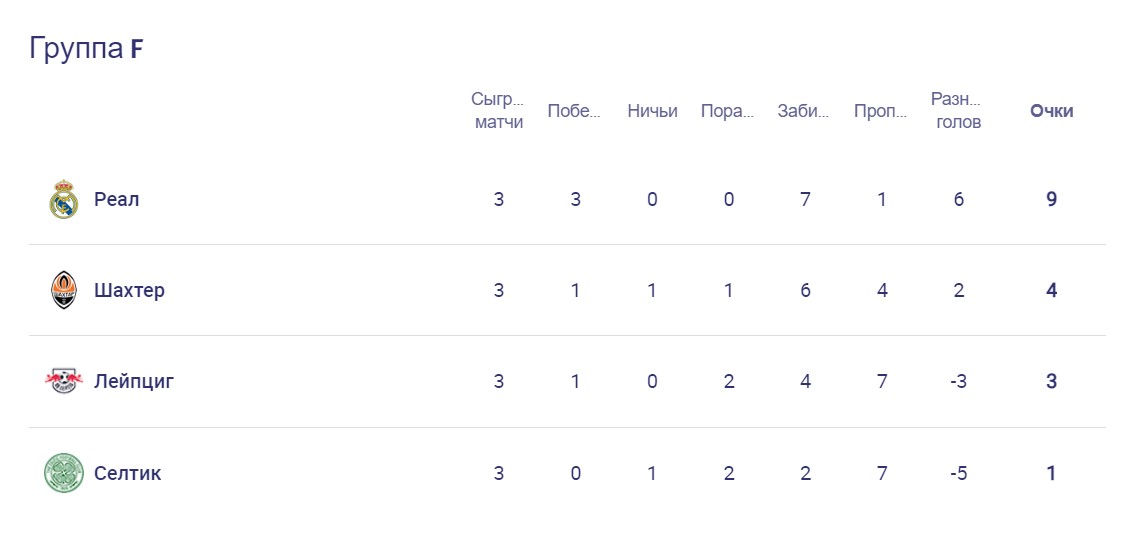 23:52. у "Реала" 9 очок і перше місце у групі, у "Шахтаря" залишається чотири, у "Лейпцига" три, а у "Селтіка" один пункт