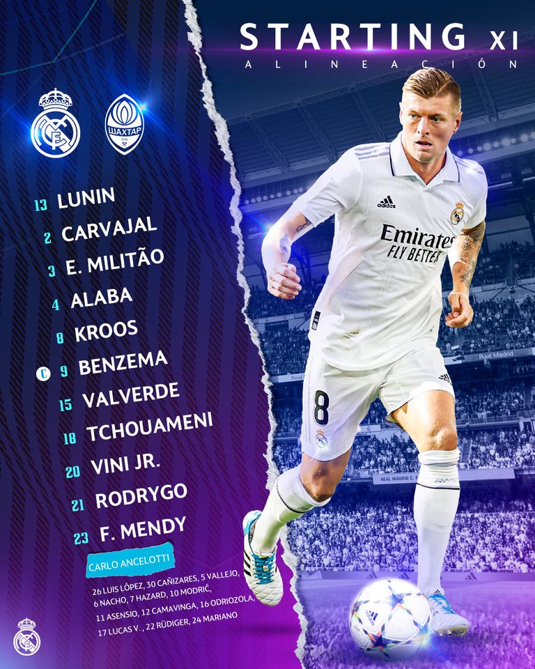 Реал: 13. Андрій Лунін - 2. Даніель Карвахаль, 3. Едер Мілітао, 4. Давид Алаба, 23. Ферлан Менді - 15. Федеріко Вальверде, 18. Орельєн Тчуамені, 8. Тоні Кроос - 21. Родріго, 9. Карім Бензема, 20. Вінісіус Жуніор