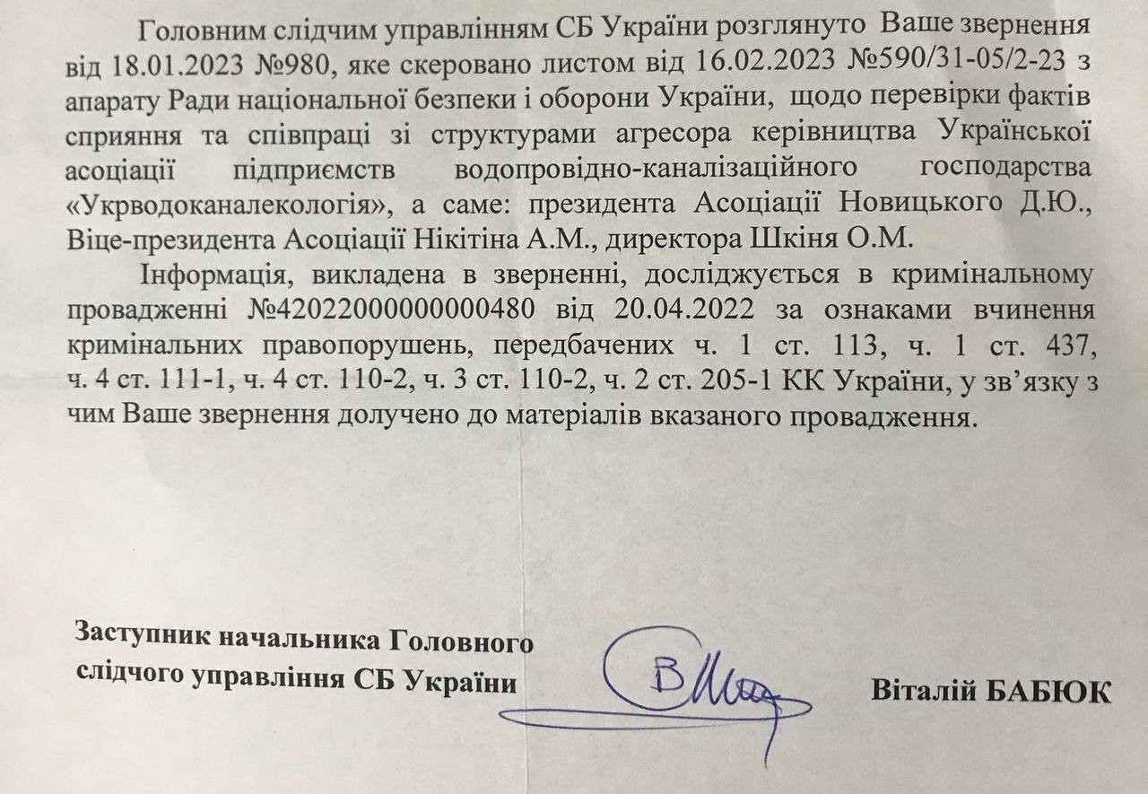 Лист СБУ з приводу співпраці зі структурами агресора керівництва асоціації "Укрводоканалекологія"