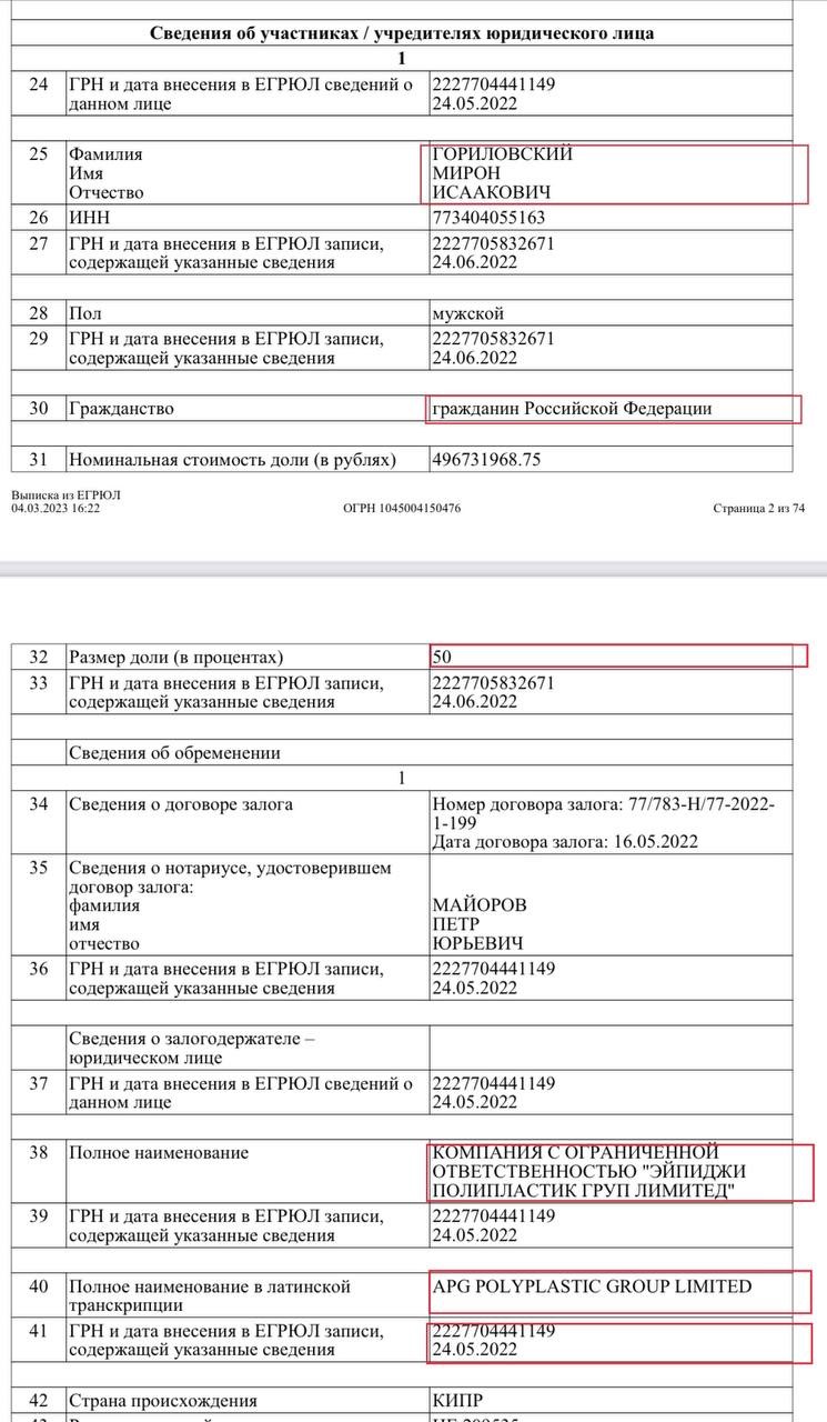 Однак, з виписки в єдиному реєстрі фізичних та юридичних осіб рф зазначається, що ООО "Група Полипластик" володіє Горіловський Мирон Ісакович через кіпрську компанію APG POLYPLASTIC GROUP LIMITED. В Українському реєстрі зазначено, що дана компанія належить Ігорю Стрільцю, на якого було переоформлено активи російської групи Поліпластик в Україні. Виходить так, що реальний бенефіціар не змінився. Адже заводами в росії володіє та сама кіпрська компанія APG POLYPLASTIC GROUP LIMITED, де кінцевим бенефіціаром є Мирон Горіловський, який контролює ключову частку.