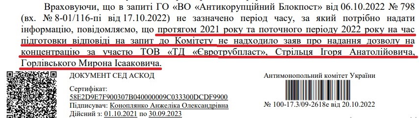 Відповідь АМКУ про відсутність дозволу на придбання ТОВ "ТД "Євротрубпласт" Ігорем Стрільцем