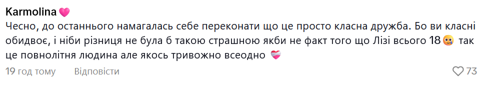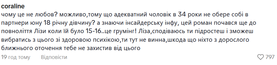 Ролик, на якому зібрані романтичині моменти пари, Ліза підписала рядком із їхньої дуетної пісні "Чому це не любов?". У коментарях користувачі почали пояснювати, чому, на їхню думку, цей роман - "не любов".