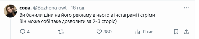 Дехто вирішив зауважити на цінах щодо реклами в соцмережах стрімера: "Ви бачили ціни на його рекламу в нього в інстаграмі і стріми. Він може собі таке дозволити за 2-3 сторіс)".