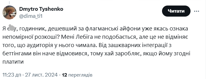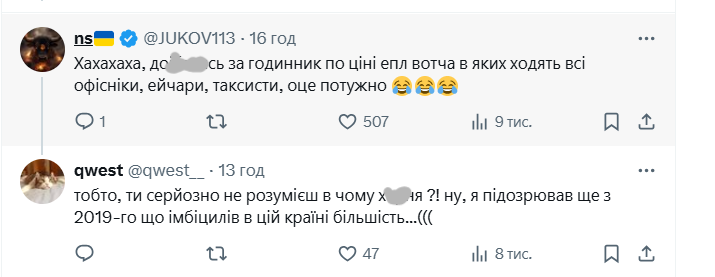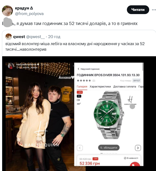 Зокрема користувач з ніком @from_polyova іронічно зауважив: "Бл**ь, я думав там годинник за 52 тисячі доларів, а то в гривнях".