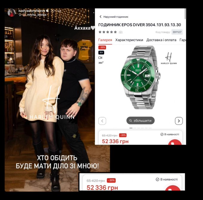 До допису додали фото, яке українська співачка Надя Дорофеєва виставила в історіях на своїй instagram-сторінці. Саме на цьому кадрі у Лебіги помітили годинник за нібито 52 336 грн.