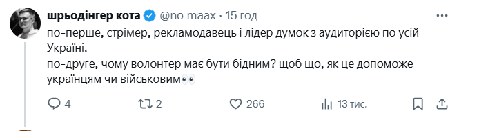 "По-перше, стрімер, рекламодавець і лідер думок з аудиторією по усій Україні. По-друге, чому волонтер має бути бідним? щоб що, як це допоможе українцям чи військовим".